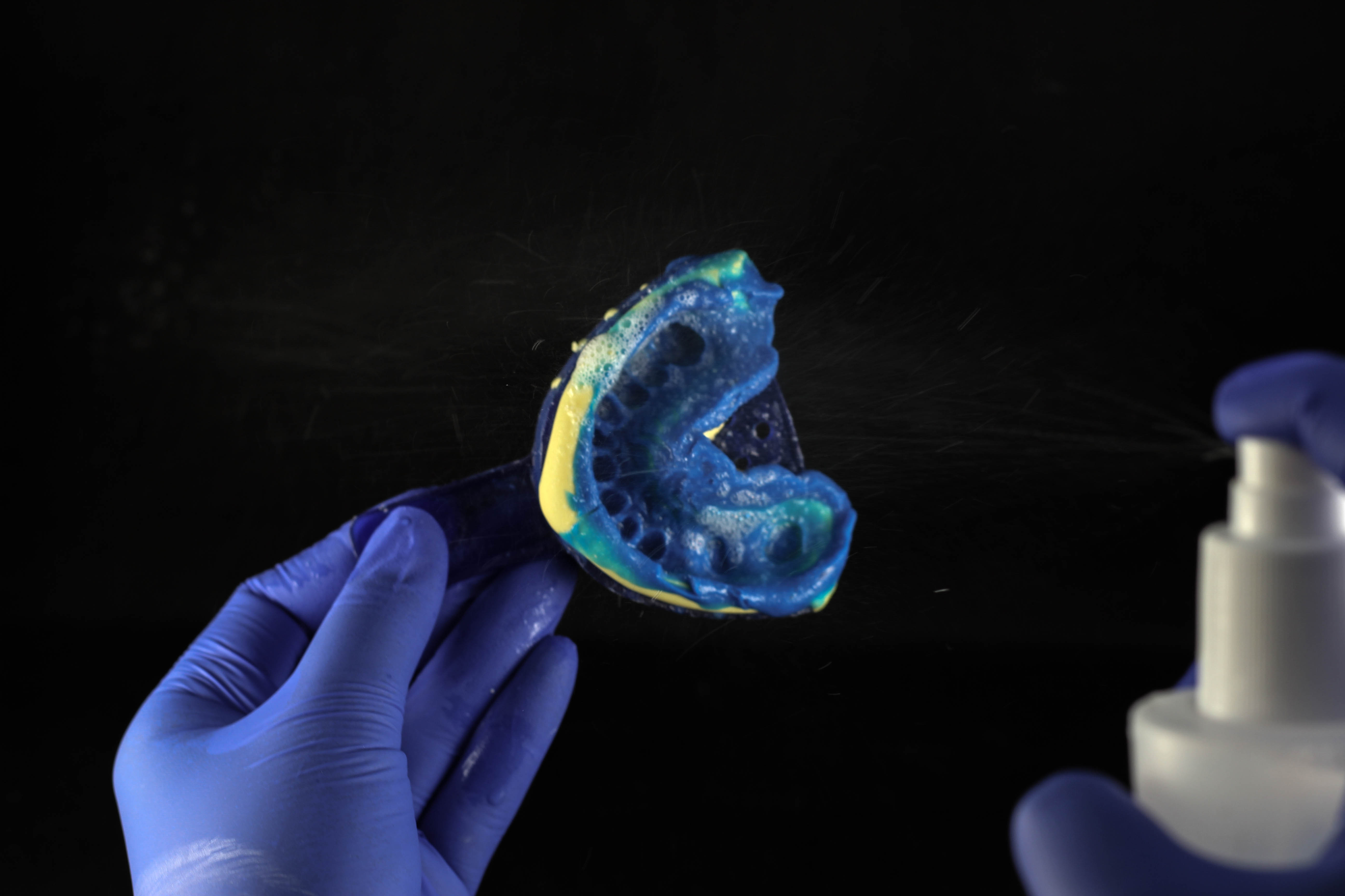 Otisak kao objekt koji dolazi u kontakt sa slinom, a često i krvlju, sigurno je potencijalni prenosnik zaraze kojim se uzročnici mogu prenijeti u zubotehnički laboratorij. Kako bismo spriječili ili barem umanjili tu mogućnost, prije izlivanja u zubotehničkom laboratoriju otisak valja dezinfikovati. Otisak je potrebno prvo isprati pod tekućom hladnom vodom kroz 30 sekundi kako bi se odstranila slina ili eventualno ostaci krvi. Slavina mora imati mrežicu (perlator) kako jaki mlaz vode ne bi oštetio otisnute fine detalje na otisku.