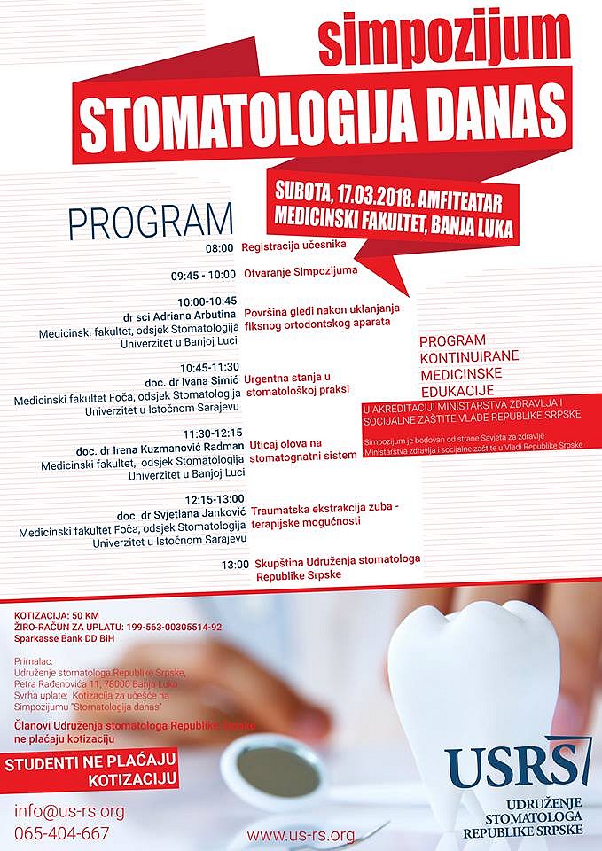Udruženje stomatologa Republike Srpske organizuje simpozijum pod nazivom “Stomatologija danas”, koji će se održati u amfiteatru Medicinskog fakulteta u Banjoj Luci, 17. marta 2018. godine.