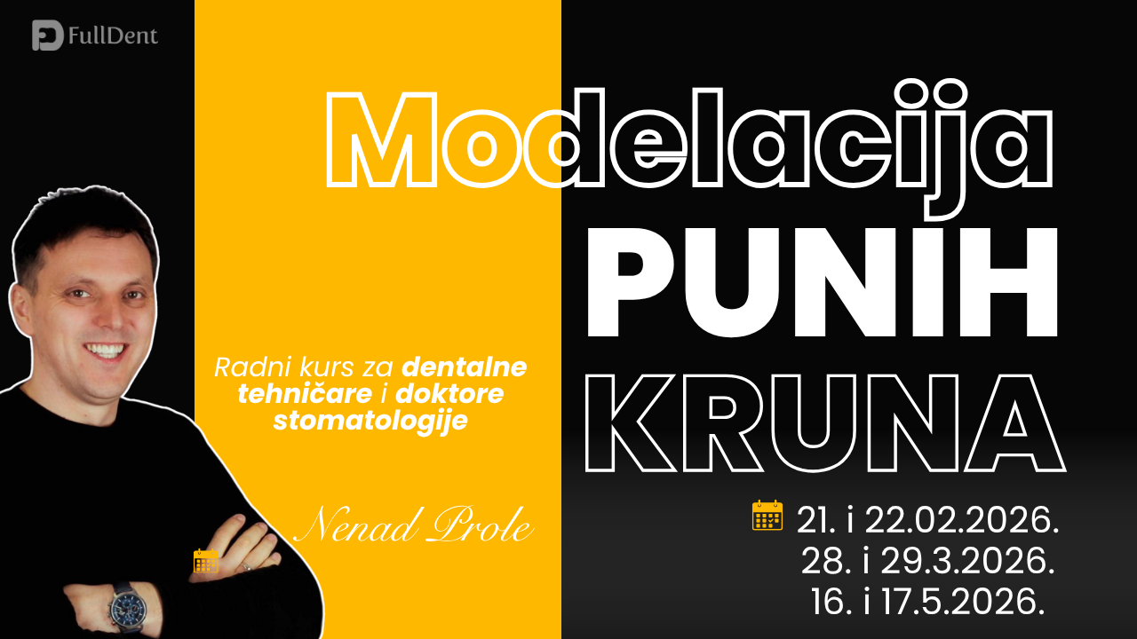 Ukoliko ste zubni tehničar ili stomatolog kojeg zanima digitalni dizajn u stomatologiji, pozivamo Vas da se prijavite za učešće u radnim kursevima „Modelacija punih kruna“ u organizaciji zubotehničkog laboratorija Full Dent.