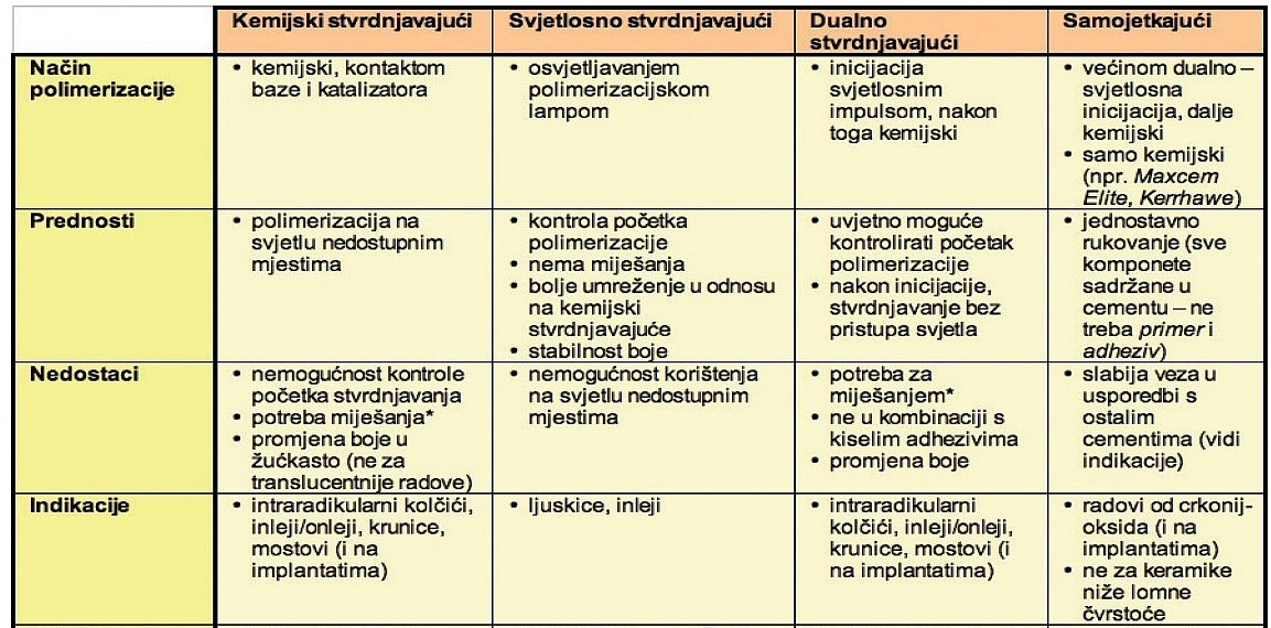 Osnovna razlika između sistema za adhezivno cementiranje je način polimerizacije, pa tako postoje hemijsko stvrdnjavajući, svjetlosno stvrdnjavajući, dual stvrdnjavajući i samojetkajući adhezivni cementi kod kojih se kiselina, primer i bond nalaze u samom cementu tako da nije potrebno kondicioniranje cakline i dentina.